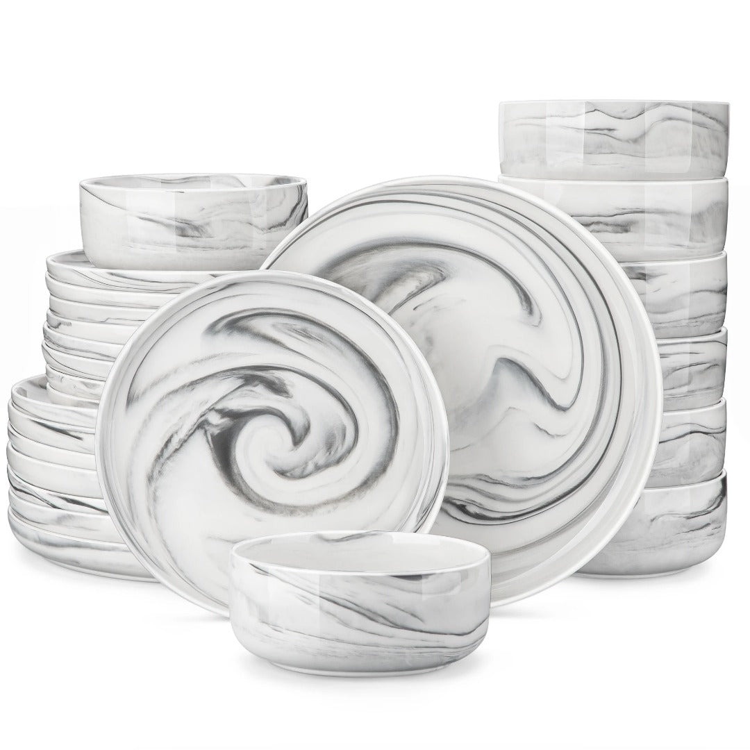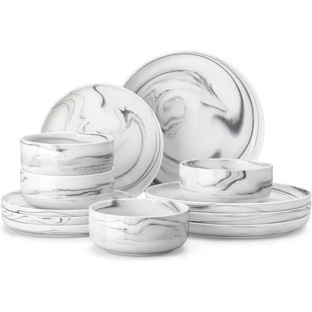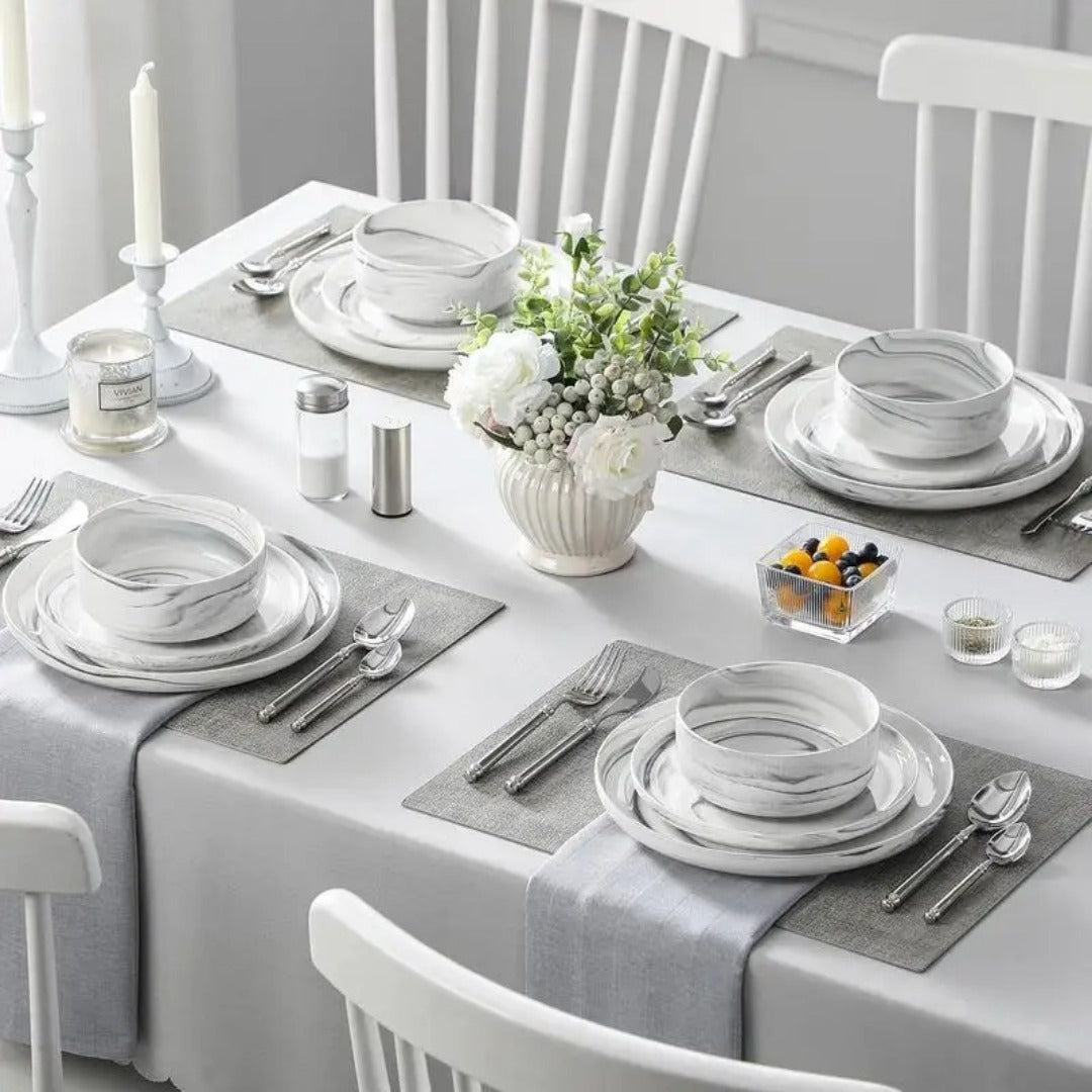 Timeless Minimalist Design: Designed with elegance in mind, this dinnerware set features simple, smooth lines inspired by the beauty of natural elements. The minimalist aesthetic of the Marble Porcelain Dinnerware Set effortlessly complements existing tableware, adding a touch of refinement to any setting. Its versatile design ensures it blends seamlessly into both casual and formal dining environments.